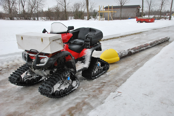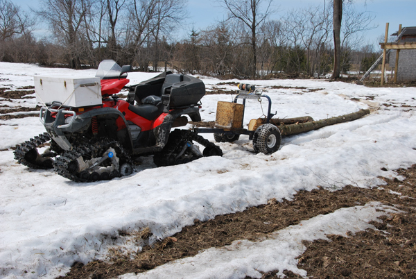Tow ropes are used during harvesting of logs from a woodlot. They are made from braided SupreemX-12 (Dyneema@) in several diameters and lengths and are extremely strong. Each end is a closed loop or can be used with a steel clevis or hook. By far, these tow ropes are safer and easier to use than chains or cables.